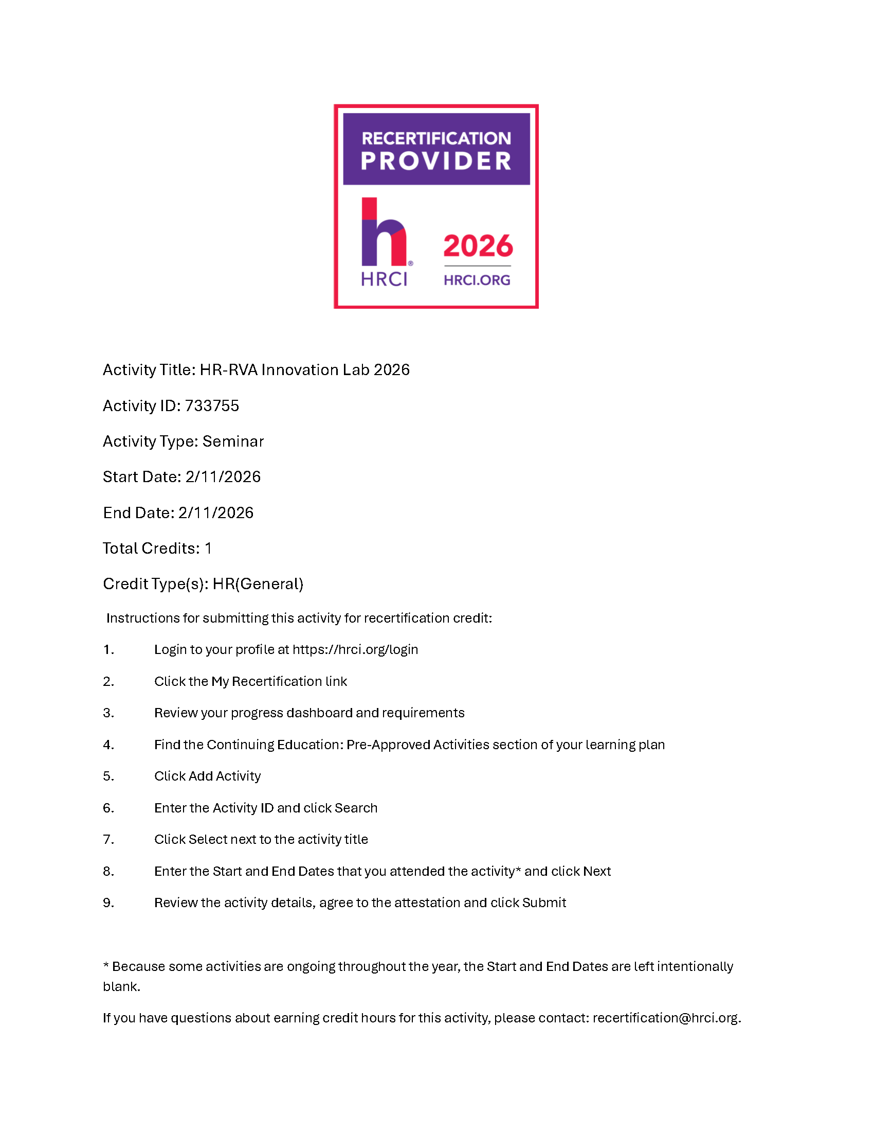 HRCI: Activity Title: HR-RVA Innovation Lab 2026, Activity ID: 733755